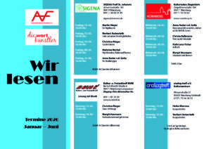 Der AutorenVerband Franken und die wortkünstler haben unter dem Titel „Wir lesen“ für das 1. Halbjahr 2026 wieder einen gemeinsamen Flyer mit einer Terminübersicht ihrer Nürnberger Lesereihen herausgegeben:
